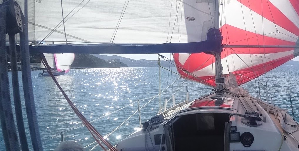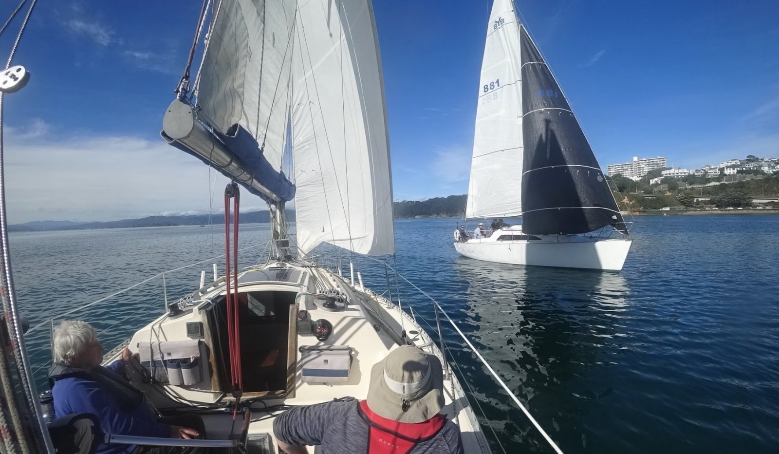 Approaching Kio Bay, we gybed towards Point Jerningham. In a twist of fortune, Usurper fell into a hole and came to a standstill, while we managed to keep just enough pressure to glide past and retake the lead.