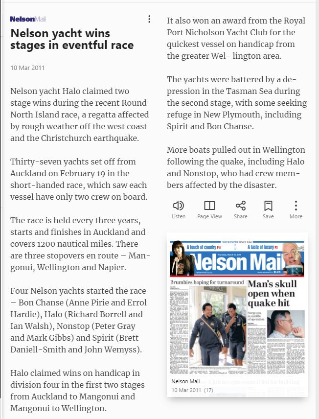 In the early 2000’s Halo was based in Nelson and owned by Richard Borrell. He enjoyed many years of racing Halo with the Tasman Bay Cruising Club and in 2011 he competed in the Round North Island Two Handed Race. See: Nelson Mail report on Halo.